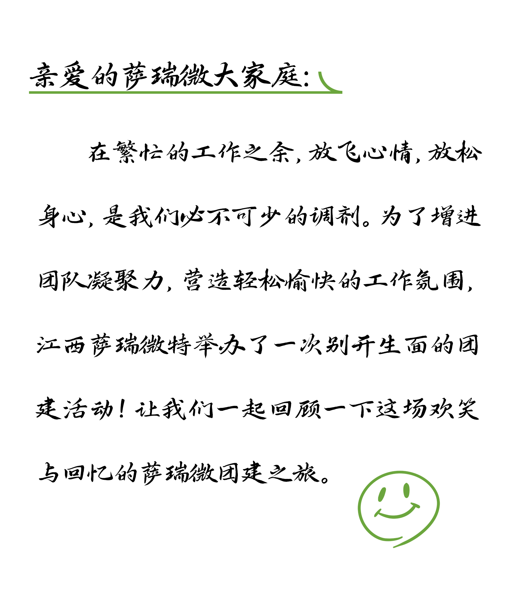 一个人的努力是加法,一个团队的努力是乘法,真正的团队是你中有我,我中有你的包容;我们一起感受团队合作、凝心聚力的快乐!